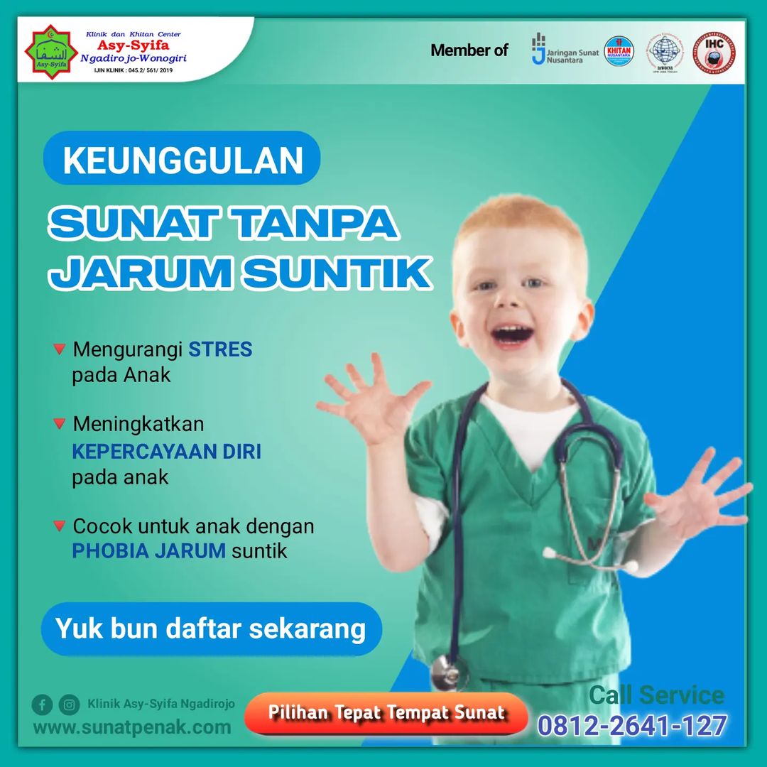 Klinik dan Khitan Center Asy-Syifa Ngadirojo adalah klinik pusat layanan khitan Modern tempat sunat bayi, anak, dewasa di Wilayah kota Wonogiri adalah pilihan bagi ayah bunda, di Klinik dan Khitan Center Asy-Syifa Ngadirojo ditangani oleh dokter terpercaya dengan fasilitas kesehatan yang memiliki reputasi yang baik. Agar semua manfaat sunat dapat diraih tanpa harus khawatir. silahkan ayah bunda kunjungi klinik kami di Klinik dan Khitan Center Asy-Syifa Ngadirojo