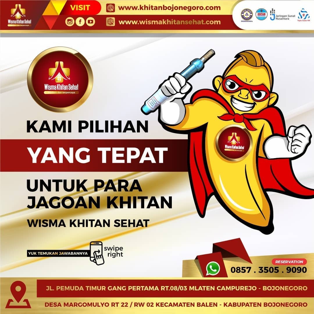 Merupakan tempat khusus khitan modern di kota Tuban dan kota kota sekitar. Adalah sesuatu banget bagi seorang anak ketika bersunat di tempat yang terkeren di kota ini. Rasa bangga bercampur bahagia jika sebuah prosesi khitan diaksanakan di tempat sunat yang terkeren. Selain tempatnya keren, dokter nya juga gaul dan paham apa yang dimaui oleh anak yang hendak sunat. Kesan bahagia dan santai ketika khitan di WISMA KITAN SEHAT. Tempat yang nyaman bersih dan modern serta banyak pilihan metode sunat modern terkini, tentu akan menambah sebuah kebahagiaan tersendiri bagi anak.