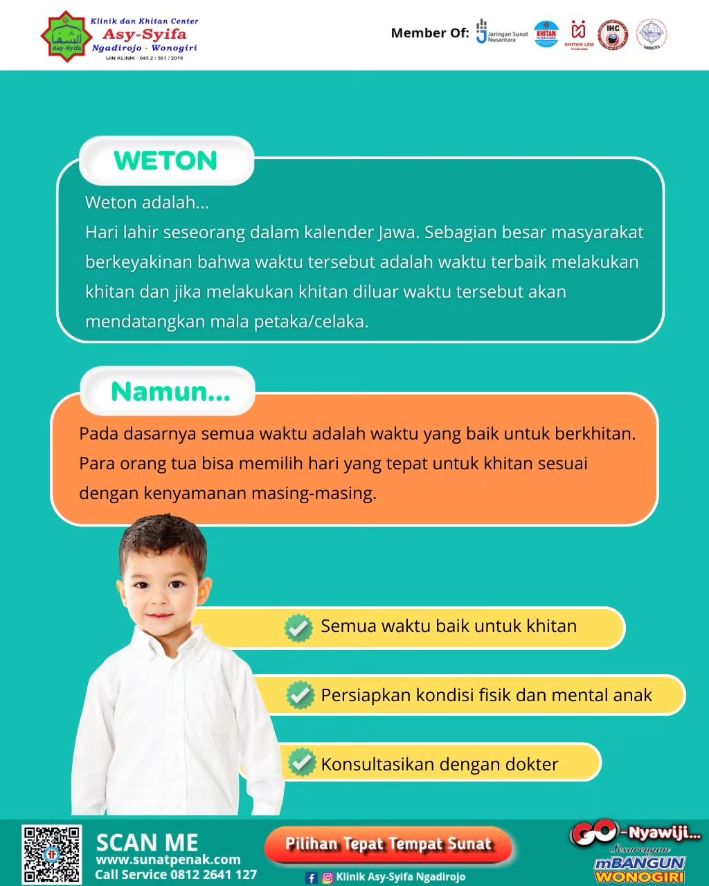 Menurut Klinik Asy Syifa Ngadirojo, khitan harus dilakukan sesuai dengan ajaran agama Islam dan tidak harus sesuai dengan weton. Weton dapat diartikan sebagai tradisi atau kebiasaan yang berlaku di suatu wilayah atau komunitas tertentu.