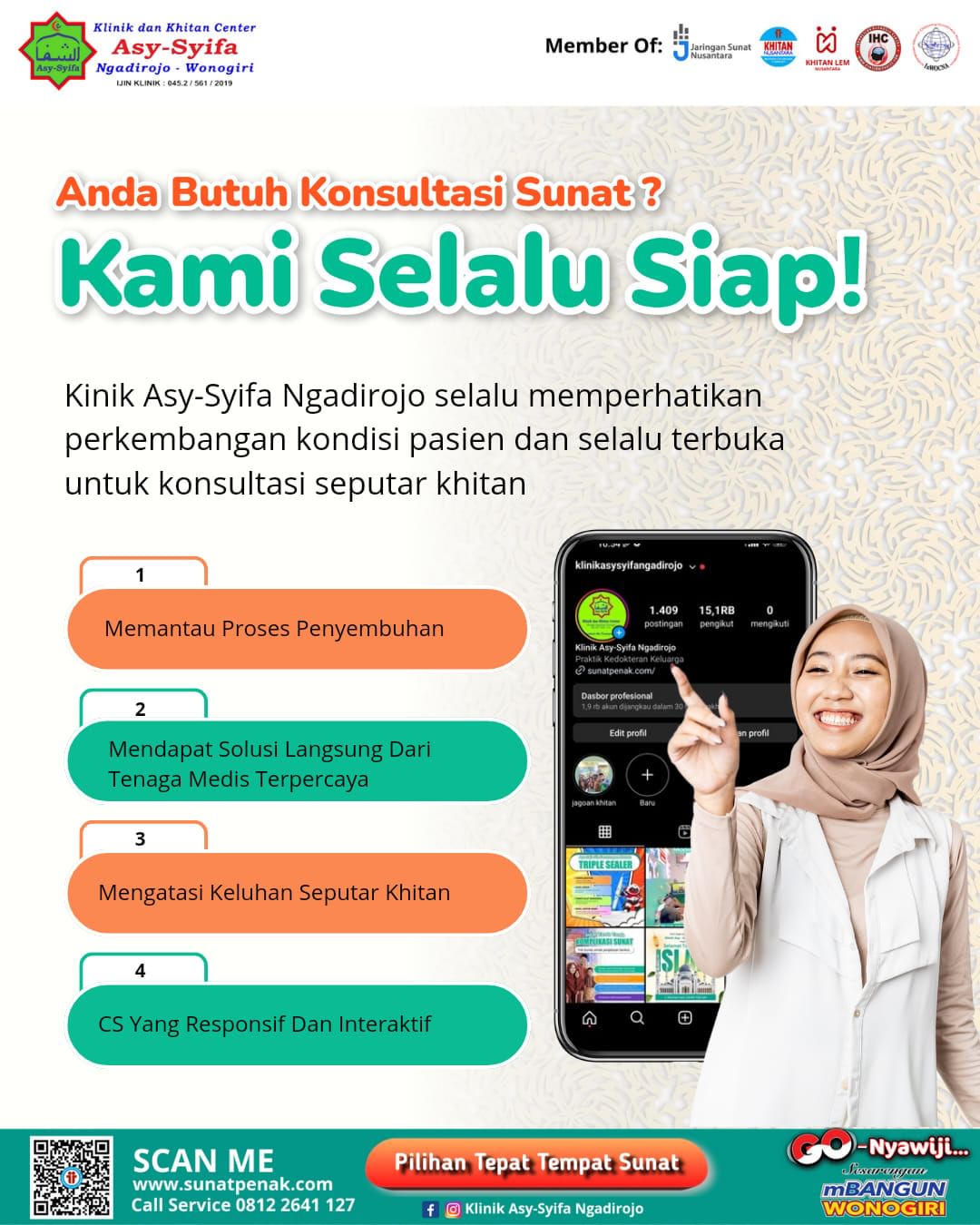 Konsultasi seputar sunat dengan Klinik Asy-Syifa Ngadirojo Wonogiri dapat dilakukan melalui berbagai metode yang tersedia. Berikut adalah informasi yang dapat membantu Anda dalam mengatur proses sunat: