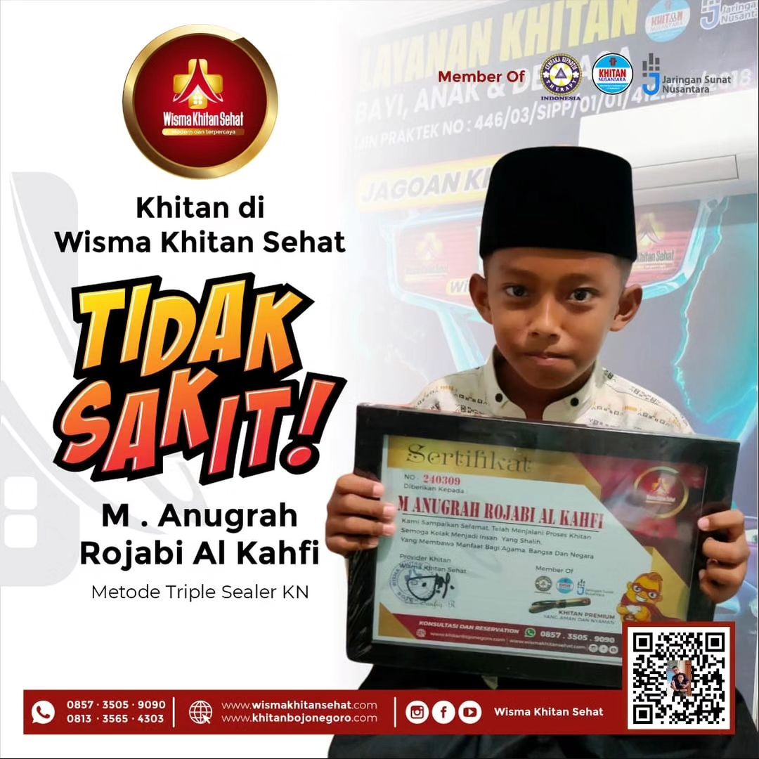Terakhir, selamat kepada M. Anugrah Rojabi Al Kahfi yang telah dikhitan dengan metode Triple Sealer KN di Wisma Khitan Sehat. Semoga khitan ini membawa manfaat kesehatan yang baik bagi kehidupan Anda di masa depan.