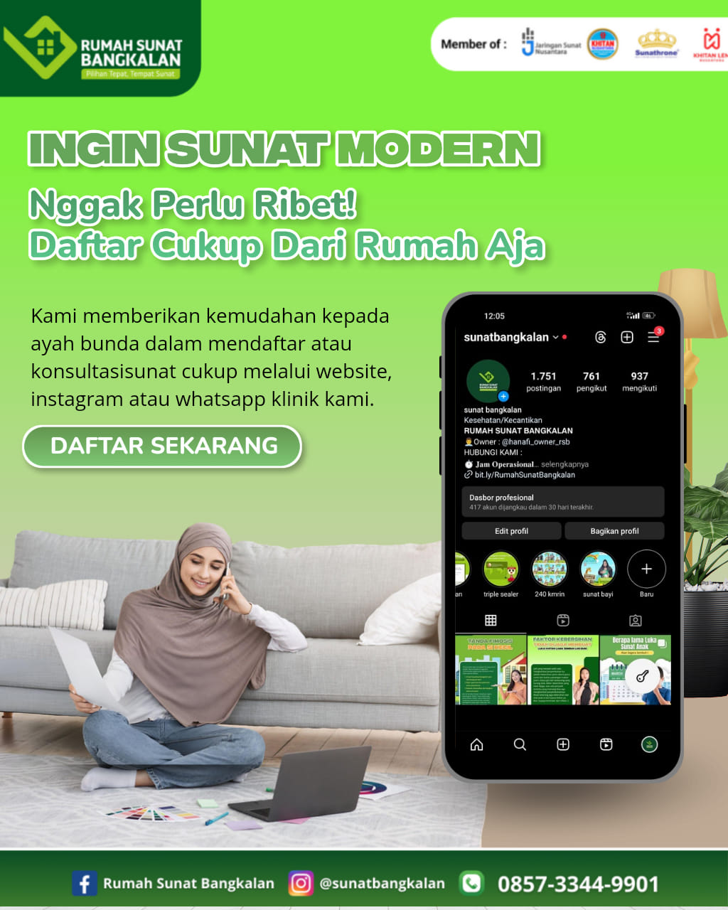 Sunat Anak Sambut Liburan Sekolah di Bangkalan – Dengan Metode Sunat Modern Yang Ditangani Dokter Sunat Berpengalaman Dan Profesional. Di tengah liburan sekolah yang menyenangkan, banyak orang tua yang memilih untuk melaksanakan sunat bagi anak laki-laki mereka. Sunat merupakan sebuah tradisi penting dan sering kali dianggap sebagai langkah penting dalam agama Islam. Bagi orang tua yang tinggal di Bangkalan dan sekitarnya, Rumah Sunat Bangkalan dapat menjadi pilihan yang tepat untuk melaksanakan sunat anak dengan aman dan nyaman. Dengan metode sunat modern dan dokter sunat berpengalaman serta profesional, Rumah Sunat Bangkalan siap membantu proses sunat anak Anda.